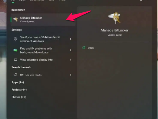 1. من قائمة البحث ، حدد موقع إدارة BitLocker وقم بتشغيله.