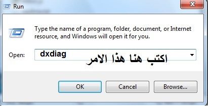 اولا افتح قائمة Start وابحث عن كلمة Run وقم باختيارها ستظهر لك نافذة صغيرة اكتب بداخلها كلمة dxdiag واضغط على OK