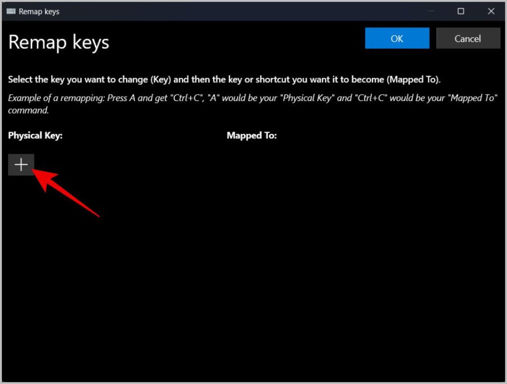 5. في نافذة Remaps keys ، انقر فوق رمز الجمع الموجود أسفل خيار المفتاح المادي.