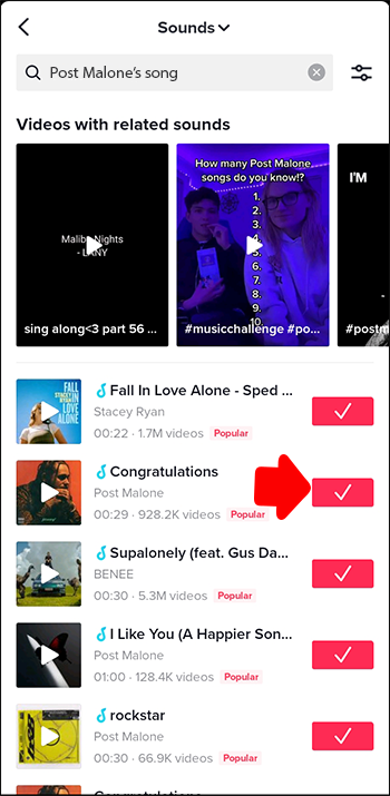 - في الشاشة التالية ، انقر فوق شريط البحث واكتب أغنية Post Malone التي تريد دمجها في فيديو TikTok الخاص بك.