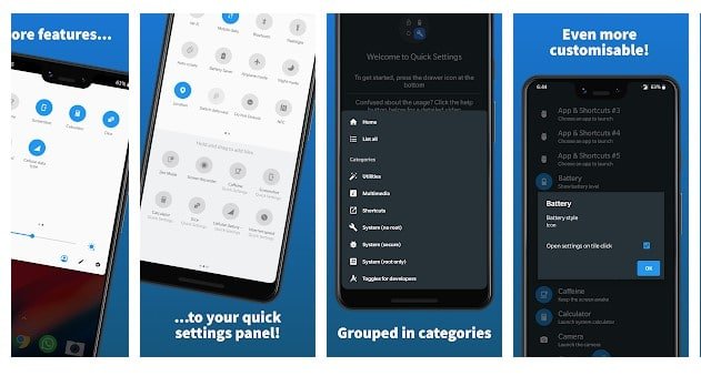 يضيف هذا التطبيق بشكل أساسي إعدادات سريعة على مصراع الإشعارات. لن تصدق ذلك ، لكن التطبيق يوفر الآن أكثر من 53 إعدادًا سريعًا مختلفًا مثل Dice ، و Counter ، و Night Screen Filter ، و Weather ، و Battery ، و Volume ، وما إلى ذلك ، لذا ، فإن Quick Settings هو بالتأكيد أفضل تطبيق Android لتخصيص شريط الحالة.