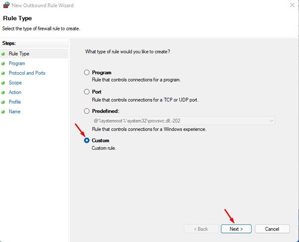 5. في النافذة المنبثقة “نوع القاعدة” ، حدد ” مخصص ” وانقر فوق الزر ” التالي ” .