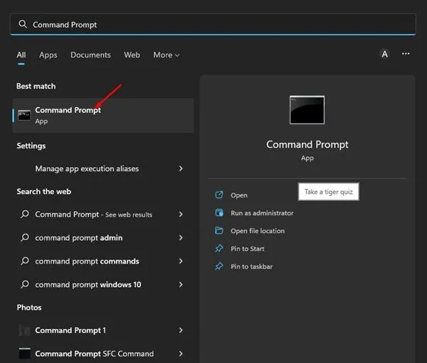 1. انقر فوق بحث Windows 11 واكتب موجه الأوامر . بعد ذلك ، افتح الأداة المساعدة موجه الأوامر من قائمة النتائج المطابقة.