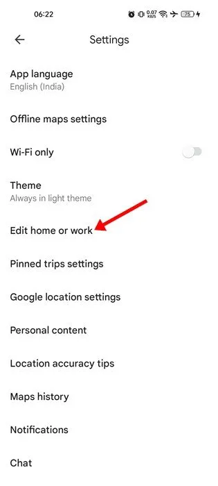 4. في شاشة الإعدادات ، اضغط على خيار تحرير المنزل أو العمل .