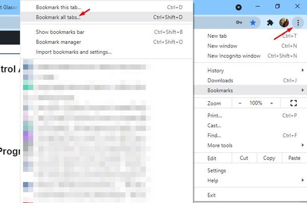 الخطوة 2. افتح مواقع الويب وانقر على النقاط الثلاث> الإشارات المرجعية> وضع إشارة مرجعية على جميع علامات التبويب .