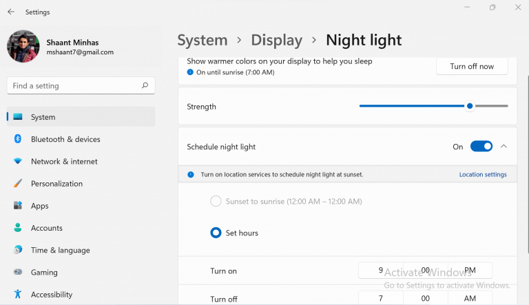 - الآن ، قم بالتبديل إلى شريط التمرير Night light لتمكين تطبيق Night light.