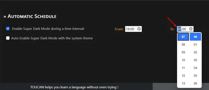 8. بمجرد الانتهاء من ذلك ، حدد وقت إيقاف التشغيل للوضع المظلم في مربع “إلى” .