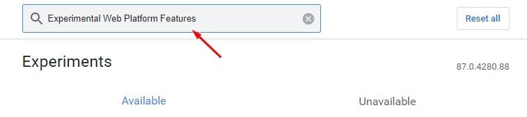 الخطوة الثالثة. في مربع البحث ، اكتب “ميزات النظام الأساسي للويب التجريبية”.