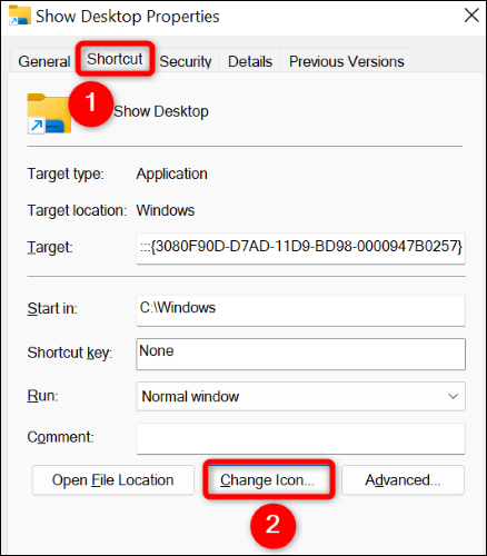 للقيام بذلك ، انقر بزر الماوس الأيمن فوق الاختصار واختر “خصائص”. ثم حدد علامة التبويب “اختصار” وانقر على “تغيير الرمز”.