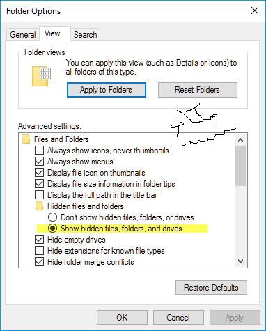 - انقر على”Show hidden files, folders, and drives”. وسوف يتم اظهار كل الملفات المخفية.