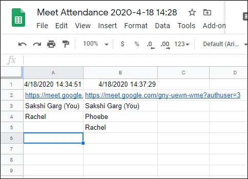 سيتم تسجيل أسماء المشاركين الحاضرين في جدول بيانات Google جنبًا إلى جنب مع تاريخ ووقت الحضور الذي تم تسجيله وتفاصيل الاجتماع.
