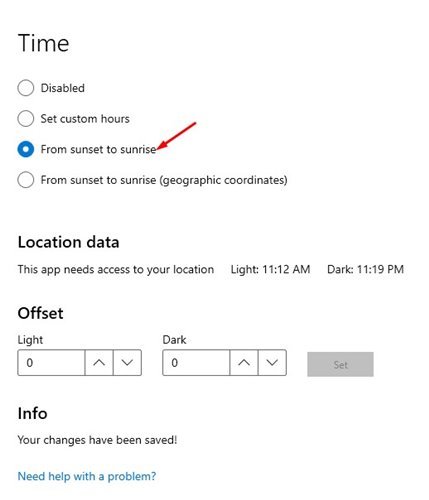 6. الآن قم بتعيين وقت البدء المخصص لكل من الوضع الفاتح والداكن.