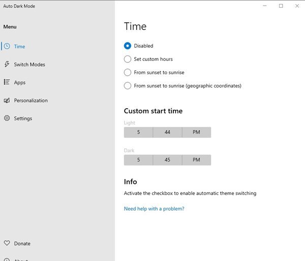 على الرغم من أنه لا يمكن التبديل تلقائيًا بين الوضع الداكن والضوء على نظام التشغيل ويندوز 10/11 ، يمكنك استخدام أداة مجانية تابعة لجهة خارجية لتمكين هذه الميزة. تطبيق Auto Dark Mode X مفتوح المصدر متاح الآن على Github ، مما يسمح لك بالتبديل بين السمات الفاتحة والداكنة بناءً على الوقت.
