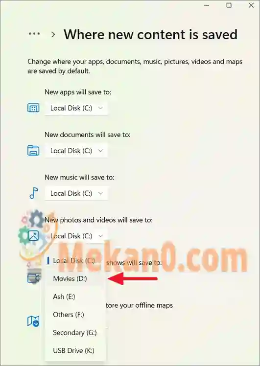 هنا ، سترى قائمة من القوائم المنسدلة لتغيير مكان حفظ التطبيقات والمستندات والموسيقى والصور ومقاطع الفيديو والأفلام والبرامج التلفزيونية والخرائط غير المتصلة بالإنترنت.
