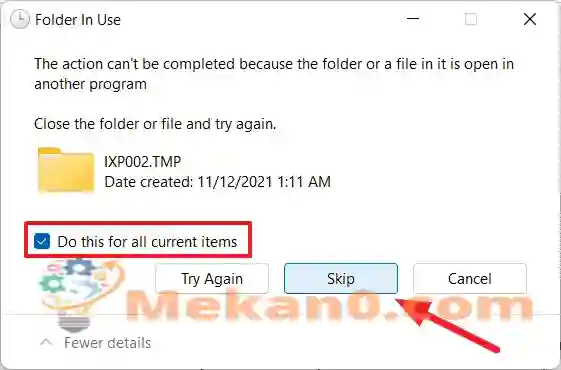 قد ترى تنبيهًا يخبرك بأنه لا يمكنك حذف ملفات أو مجلدات معينة لأنها قيد الاستخدام حاليًا بواسطة بعض التطبيقات النشطة. لذلك ، انقر فوق “تخطي” لتخطي العنصر الحالي أو تحديد الخيار “القيام بذلك لجميع العناصر الحالية” وانقر فوق “تخطي” لتخطي جميع العناصر قيد الاستخدام.