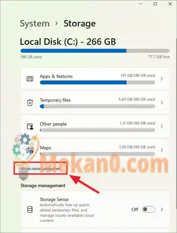 في صفحة إعدادات التخزين ، سترى ما يشغل مساحة ضمن القرص المحلي (C 🙂 وسترى مقدار المساحة الخالية المتوفرة. لمشاهدة المزيد من فئات استخدام التخزين ، انقر فوق “إظهار المزيد من الفئات”. لإدارة فئة ، انقر عليها.
