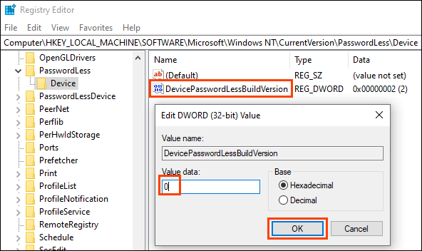 - انقر نقرًا مزدوجًا فوق مفتاح DevicePasswordLessBuildVersion وقم بتغيير بيانات القيمة من 2 إلى 0 . حدد موافق .