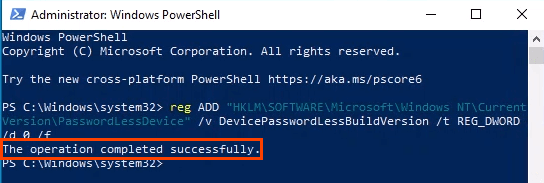 أدخل الأمر reg ADD “HKLM \ SOFTWARE \ Microsoft \ Windows NT \ CurrentVersion \ PasswordLess \ Device” / v DevicePasswordLessBuildVersion / t REG_DWORD / d 0 / f واضغط على Enter .