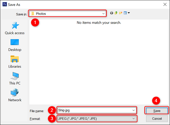 سيفتح Photoshop نافذة “حفظ باسم”. هنا ، حدد مجلدًا لحفظ صورة JPG فيه ، وانقر فوق حقل “اسم الملف” واكتب اسمًا لصورتك ، وحدد القائمة المنسدلة “تنسيق” واختر “JPEG”. ثم انقر على “حفظ”.