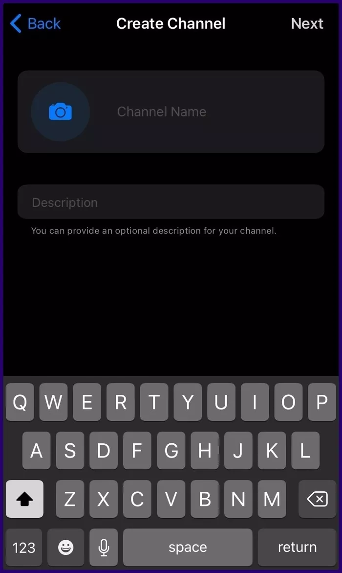 الخطوة 5: أدخل اسم القناة وأضف الوصف والصورة. بعد القيام بذلك ، اضغط على التالي.