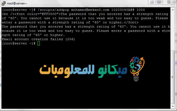 بعد تغيير الباسورد واضافة الأمر مرة اخرى عندما ينجح انشاء الأيميل سيقوم النظام بأعلامك كما موضح بالصورة اسفل ,تفيد هذه الصورة بالأسفل انه تم انشاء الايميل المطلوب [email protected] بنجاح تام