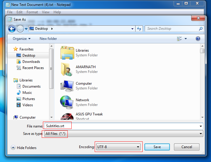 الخطوة 4. الآن احفظ الملف بأي اسم ولكن يجب أن يكون بتنسيق .SRT وفي ترميز حدد “UTF-8”.
