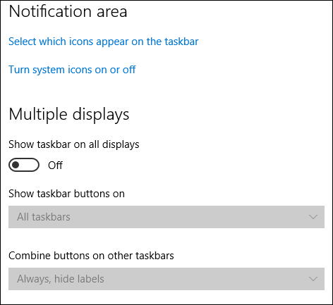 إذا كنت تستخدم شاشات متعددة ، فسيسعدك معرفة أن Windows 10 يتضمن عناصر تحكم تخصيص مناسبة لاستخدام شريط المهام الخاص بك عبر شاشات متعددة. يمكن أن يكون لديك شريط مهام معروض على شاشة عرض واحدة فقط ، وشريط مهام واحد ممتد عبر جميع شاشات العرض وحتى شريط مهام منفصل لكل شاشة يعرض فقط التطبيقات المفتوحة على تلك الشاشة. لتعديل كل هذا ، انقر بزر الماوس الأيمن فوق أي منطقة مفتوحة في شريط المهام واختر “إعدادات شريط المهام”. في نافذة الإعدادات ، قم بالتمرير وصولاً إلى الأسفل للعثور على عناصر التحكم لشاشات عرض متعددة.