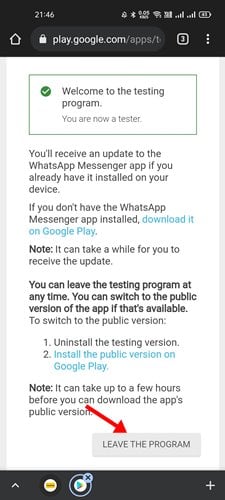 هذا كل شيء!هذا ما فعلته .إذا كنت ترغب في إنهاء برنامج واتساب بيتا ، فانتقل إلى صفحة Become a tester وانقر فوق الخيار مغادرة . _