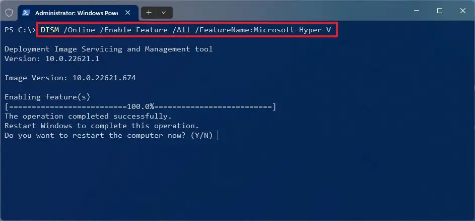 DISM / عبر الإنترنت / تمكين الميزة / الكل / اسم الميزة: Microsoft-Hyper-V