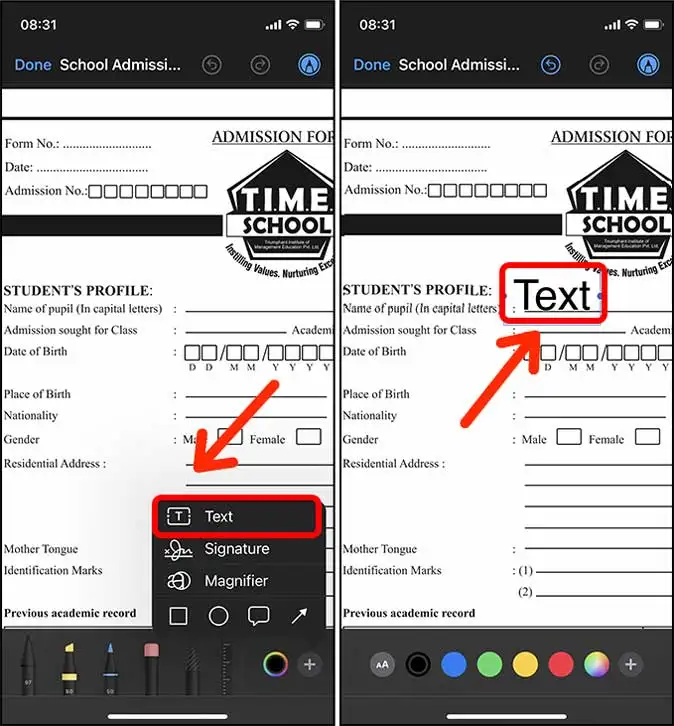 3: بعد حفظ النموذج المعبأ فيه في تطبيق “ملفات”، يمكن فتحه والنقر على زر “Markup” الموجود في الزاوية العلوية اليمنى للشاشة. سيتم عرض جميع الأدوات المتاحة في القائمة السفلية، ويمكن البدء في ملء التفاصيل المطلوبة.