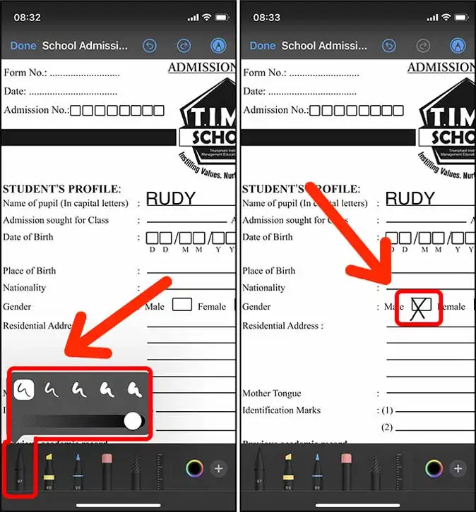 6:تحديد المربعات في نماذج PDF على iPhone باستخدام Markup هو عملية سهلة وبسيطة أيضًا. يمكن البدء بتكبير مربع الاختيار ومن ثم استخدام أداة القلم أو القلم الرصاص لملء خانة الاختيار باللون المطلوب. بعد ذلك، يمكن حفظ التغييرات وإغلاق النموذج.