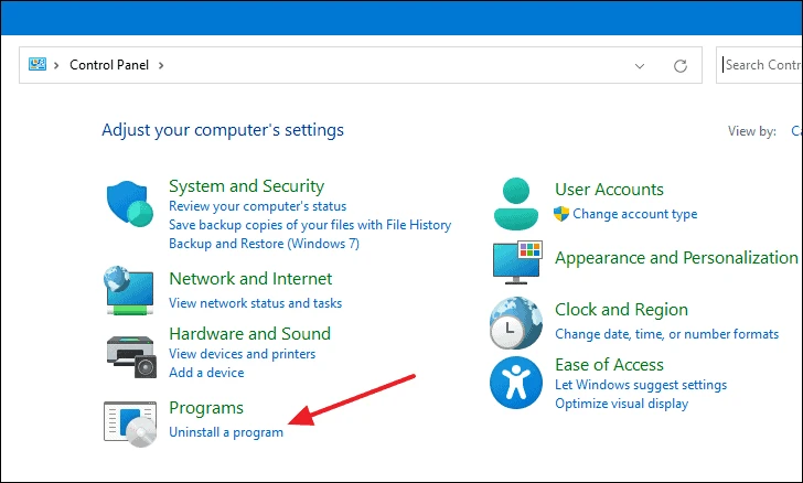 في نافذة لوحة التحكم ، انقر فوق “إزالة تثبيت برنامج”.