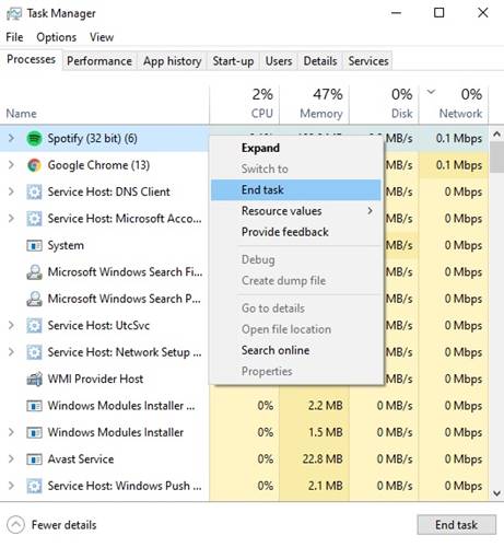 إذا كنت لا تزال تتلقى رسالة الخطأ حتى بعد إعادة التشغيل ، فأنت بحاجة إلى استخدام Task Manager على Windows 10 / Activity Monitor على Mac لإنهاء تطبيق Spotify. في نظام Windows ، انقر بزر الماوس الأيمن على شريط المهام وحدد “مدير المهام”. الآن ، في إدارة المهام ، انقر بزر الماوس الأيمن فوق Spotify وحدد “إنهاء المهمة”.