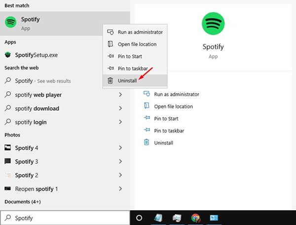 - انقر بزر الماوس الأيمن فوق تطبيق Spotify وحدد “إلغاء التثبيت”