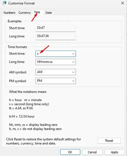 8. في تنسيقات الوقت ، أدخل ‘ s ‘ في حقل الوقت القصير . بمجرد الانتهاء ، انقر فوق الزر ” تطبيق ” . سيؤدي هذا إلى إخفاء الساعة على نظام التشغيل Windows 11.