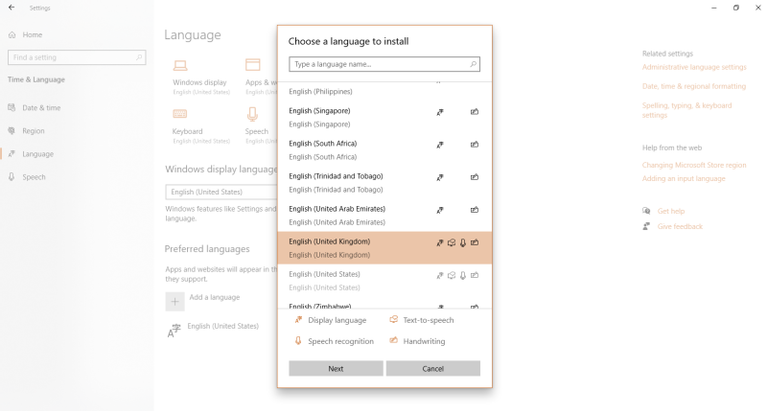 هذه هي اللغة المستخدمة في إعدادات ويندوز وقسم التعليمات ومربعات الحوار وتحويل النص إلى كلام والراوي ولوحة المفاتيح وما إلى ذلك. سيتم سرد أي حزم لغات تقوم بتثبيتها هنا ويمكن اختيارها كلغة عرض ويندوز.