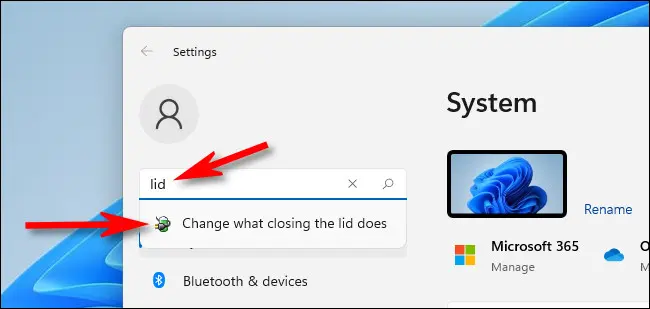 في صفحة الإعدادات، يمكنك البحث عن “الغطاء” عن طريق النقر على شريط البحث ثم اختيار نتيجة “تغيير ما يفعله إغلاق الغطاء” التي ستظهر أسفل البحث.