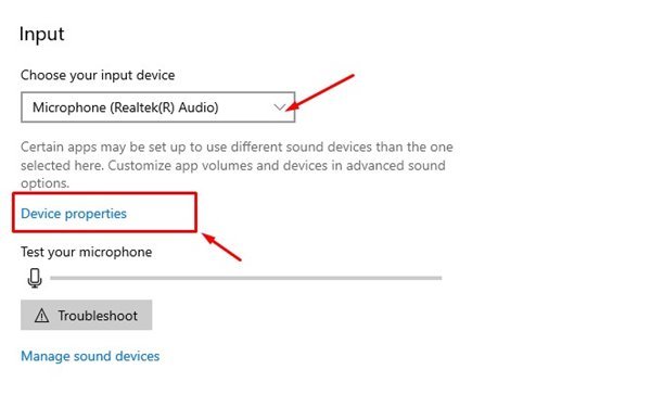 4. في الجزء الأيسر ، حدد الجهاز الذي تريد إعادة تسميته ضمن قسم الإدخال وانقر فوق خصائص الجهاز .