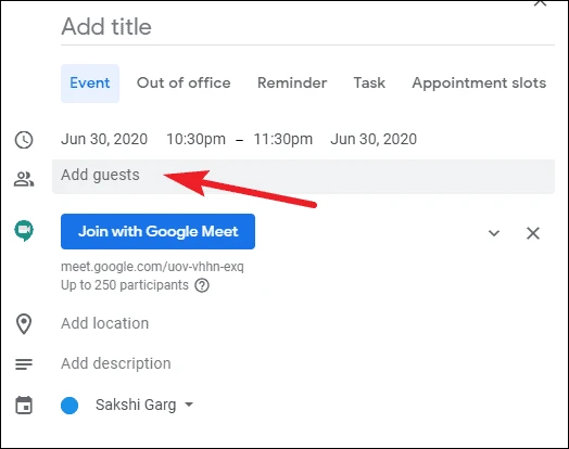 سيتم فتح صفحة حدث تقويم Google في علامة تبويب / نافذة جديدة في متصفحك. هنا ، امنح Google Meet عنوانًا ، ثم انقر فوق مربع الحقل “إضافة مدعوين” واكتب معرّفات البريد الإلكتروني للأشخاص الذين تريد دعوتهم إلى الاجتماع.