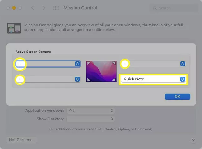 من المحتمل أن ترى شرطات لكل زاوية ساخنة باستثناء الزاوية اليمنى السفلية. بشكل افتراضي ، تفتح هذه الزاوية Quick Note منذ إصدار macOS Monterey . لكن يمكنك تغييره إذا أردت.