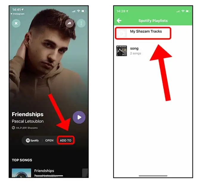 - انقر على الزر “إضافة إلى” الذي يظهر في نتائج البحث في Shazam.
