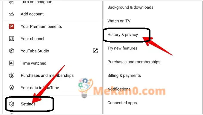 2. ثم انتقل إلى الإعدادات ثم بعد ذلك التاريخ والخصوصية .