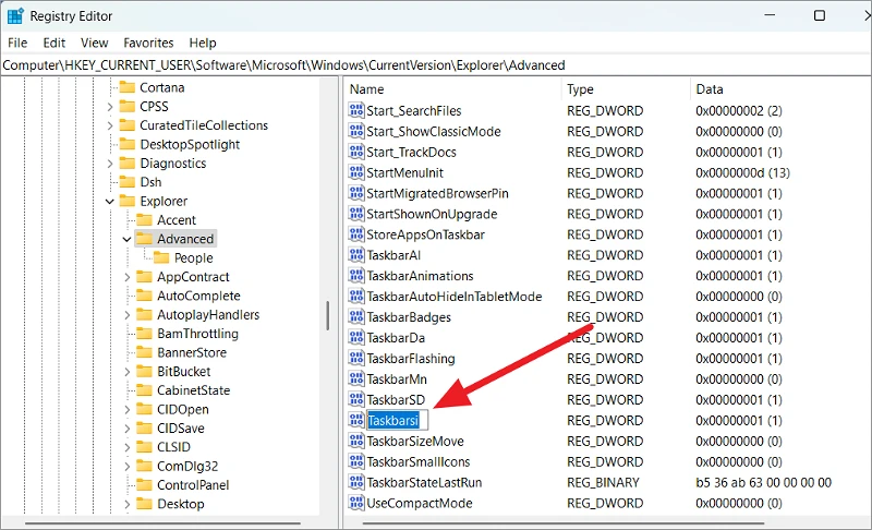 HKEY_CURRENT_USER\Software\Microsoft\Windows\CurrentVersion\Explorer\Advanced