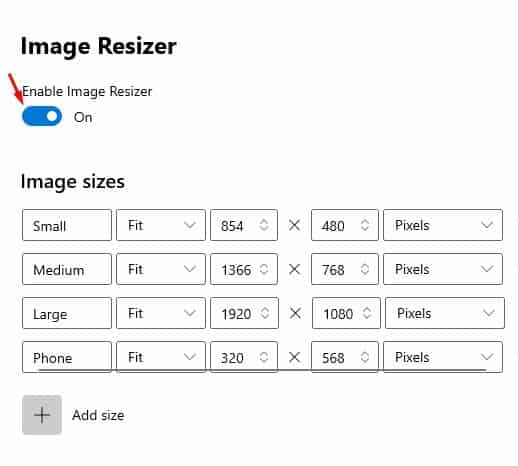 الخطوة 3. على الجانب الأيمن ، قم بتمكين خيار “تمكين أداة تغيير حجم الصورة” .