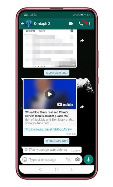 الخطوة 2. بمجرد التحديث ، افتح WhatsApp. حدد الآن جهة الاتصال التي تريد تغيير خلفية الدردشة الخاصة بها. اضغط على “النقاط الثلاث” .