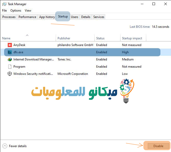 - بعد أن تقوم بفتح Task Manager ، تتوجة بالنقر على كلمة “Startup” ،