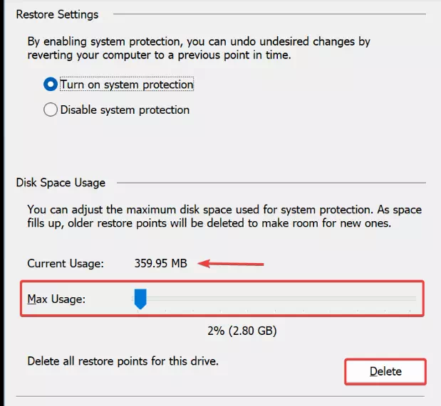 الخطوة 7. في قسم ” Disk Space Usage ” ، ستجد مقدار التخزين المستخدم بواسطة نظام Windows الخاص بك بجانب ” Current Usage. “. إذا كنت تريد تفريغ مساحة تخزين كاملة ، انقر على حذف . سيؤدي هذا الإجراء إلى حذف جميع نقاط الاستعادة.