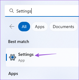 الخطوة 1: انقر فوق رمز البدء في شريط المهام ، واكتب الإعدادات في Windows Search ، واضغط على Enter لفتح تطبيق الإعدادات.