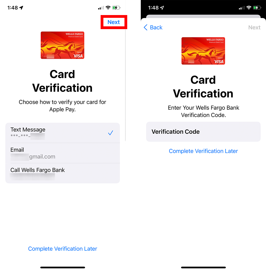 - ثم حدد طريقة التحقق وانقر فوق التالي . يمكنك التحقق من بطاقتك عن طريق إدخال رمز تم إرساله إليك عبر البريد الإلكتروني أو رسالة نصية أو يمكنك الاتصال بالمصرف الذي تتعامل معه للتحقق من حسابك.