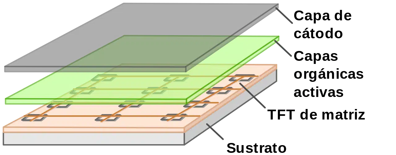 تتكون شاشة AMOLED التي تمتلكها العديد من الأجهزة المحمولة من مجموعة من وحدات البكسل OLED المدمجة في سلسلة من ترانزستورات الأغشية الرقيقة (TFT). يتم تنشيطها (أي تضيء) فقط عند تنشيطها كهربائيًا . ولتنفيذ هذه العملية بطريقة محكومة، توجد مفاتيح تتحكم في تدفق التيار الكهربائي، وتحدد مستوى سطوع كل بكسل.